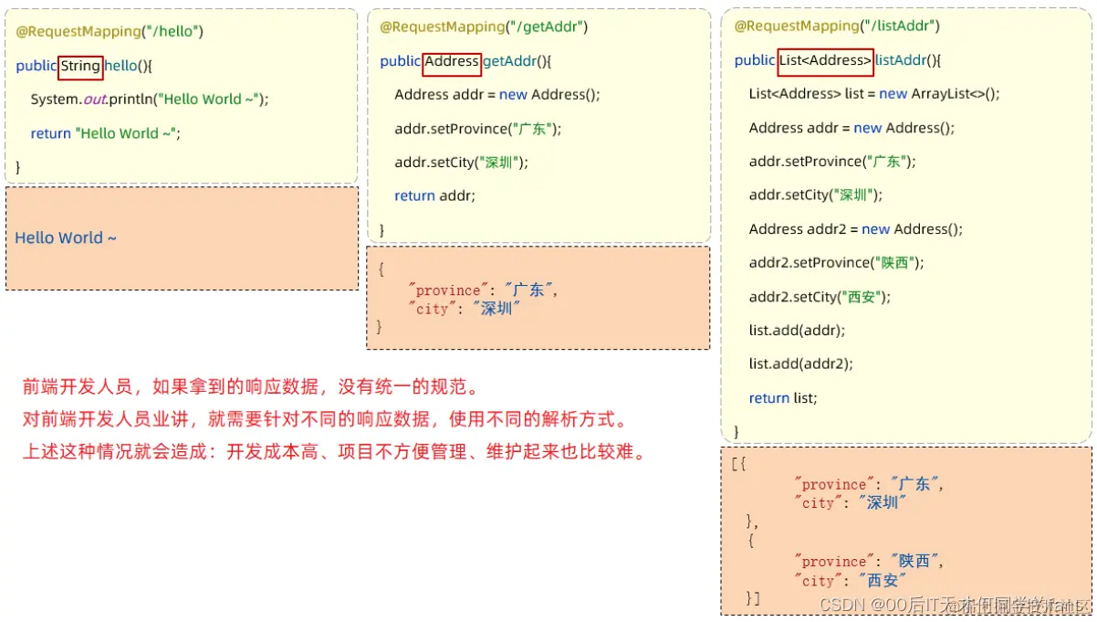 - 我们会发现我们所编写的这些Controller方法中每一个接口响应回去的数据很随意,想怎么返回就怎么返回,没有任何的规范而言,如果我们开发的是一个大型项目,所涉及到的功能可能成百上千甚至成千上万,如果没有一套统一的项目规范,前端人员发起请求之后访问到我们所开发的这个接口,最终我们响应回去的数据各式各样的都有,那此时前端人员就需要拿到这个结果进行解析,并且需要针对不同的响应数据使用不同的解析方式来解析,那这个时候前后端开发的成本就会增加,最终导致我们的项目不方便管理而且很难维护。