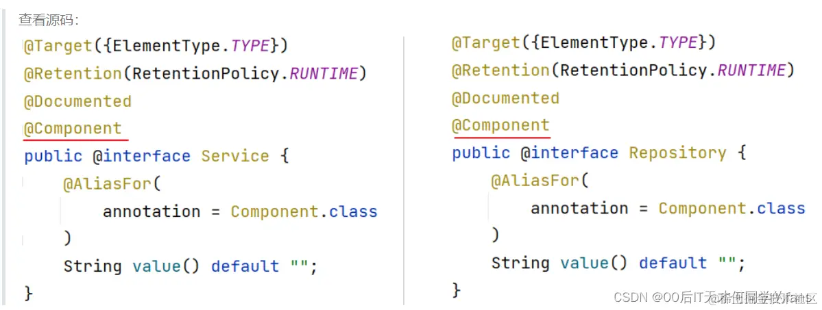 看源码会发现,@Controller、@Service、@Repository底层其实就封装了一个注解: @Compoment,上面三个是元注解,所以我们把@Controller、@Service、@Repository注解叫做@Component注解的衍生注解。