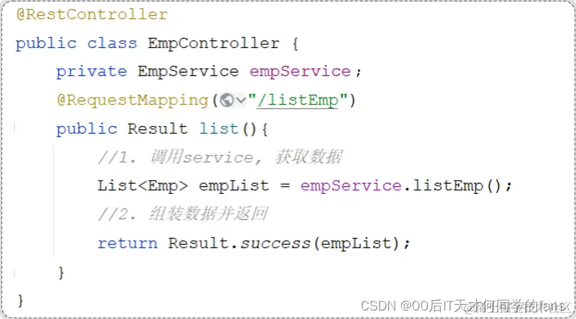 - 第三个部分是返回的数据,它的类型是Object,特别是对于一些查询的请求,它是需要返回查询的数据的,我们就可以将查询的数据封装在data这个属性当中,这样,我们在Controller方法当中返回这样一个Result对象,最终经过@ResponseBody的处理之后,就会响应这么一个JSON格式的数据。