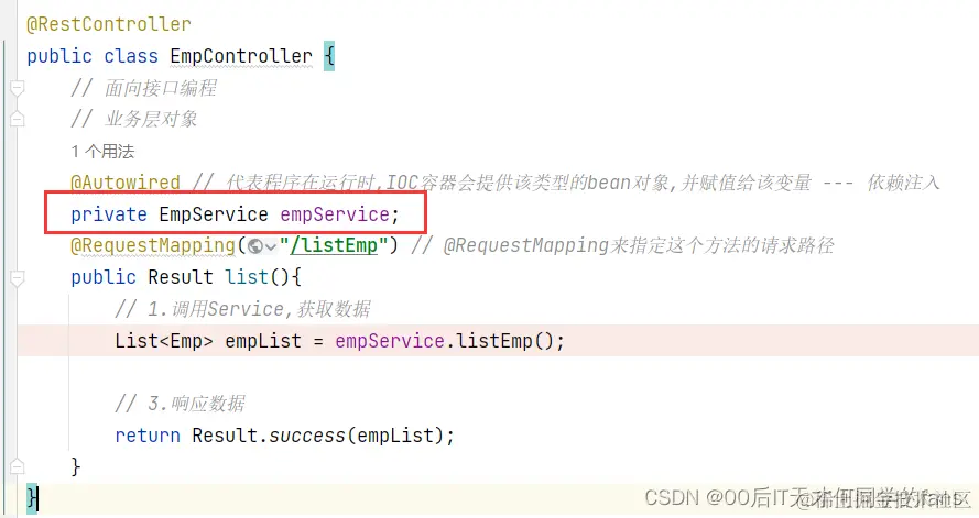 @Autowired // 代表程序在运行时,IOC容器会提供该类型的bean对象,并赋值给该变量 --- 依赖注入