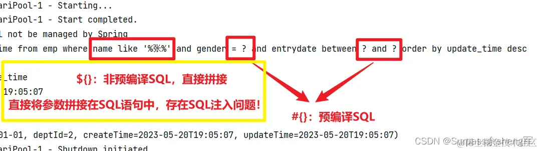 - 模糊查询使用${...}进行字符串拼接,这种方式呢,由于是字符串拼接,并不是预编译的形式,所以效率不高、且存在sql注入风险。