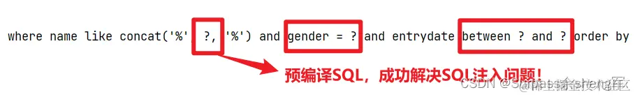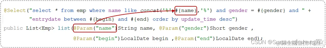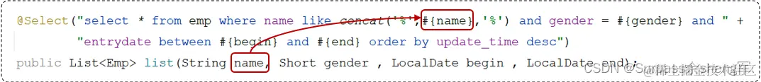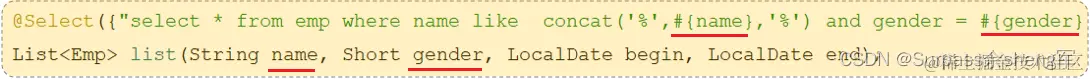 @Select("select id, username, password, name, gender, image, job, entrydate, dept_id, create_time, update_time from mybatis.emp where name like concat('%', #{name}, '%') and gender = #{gender} and entrydate between #{begin} and #{end} order by update_time desc")