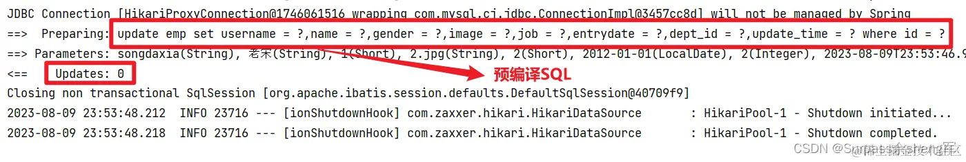 - 在SQL语句当中来动态的获取该方法在调用的时候传递进来的参数,此时就需要用到MyBatis当中提供的一个参数占位符:#{参数变量名}