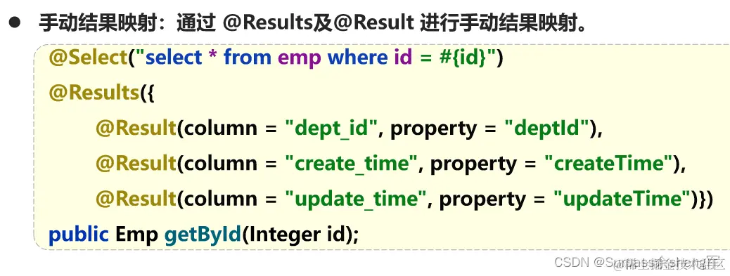 2. 手动结果映射:通过 @Results及@Result 进行手动结果映射