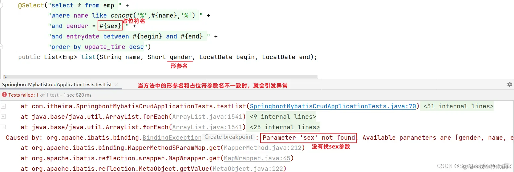在上面我们所编写的条件查询功能中,我们需要保证接口中方法的形参名和SQL语句中的参数占位符名相同。