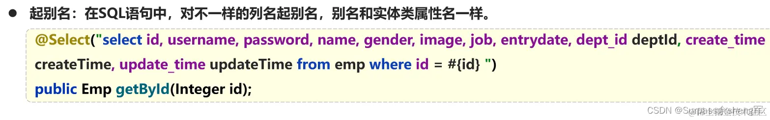 @Select("select id, username, password, name, gender, image, job, entrydate, dept_id as deptId, create_time as createTime" +
