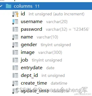 select id,username,password,name,gender,image,job,entrydate,dept_id,create_time,update_time
