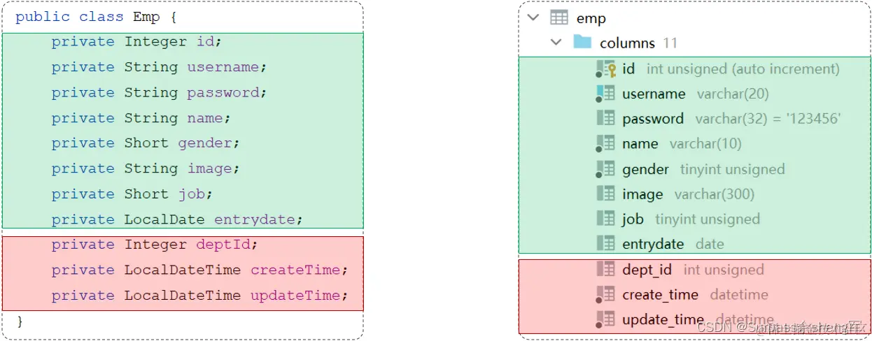 - 创建对应的实体类 Emp(实体类属性采用驼峰命名)