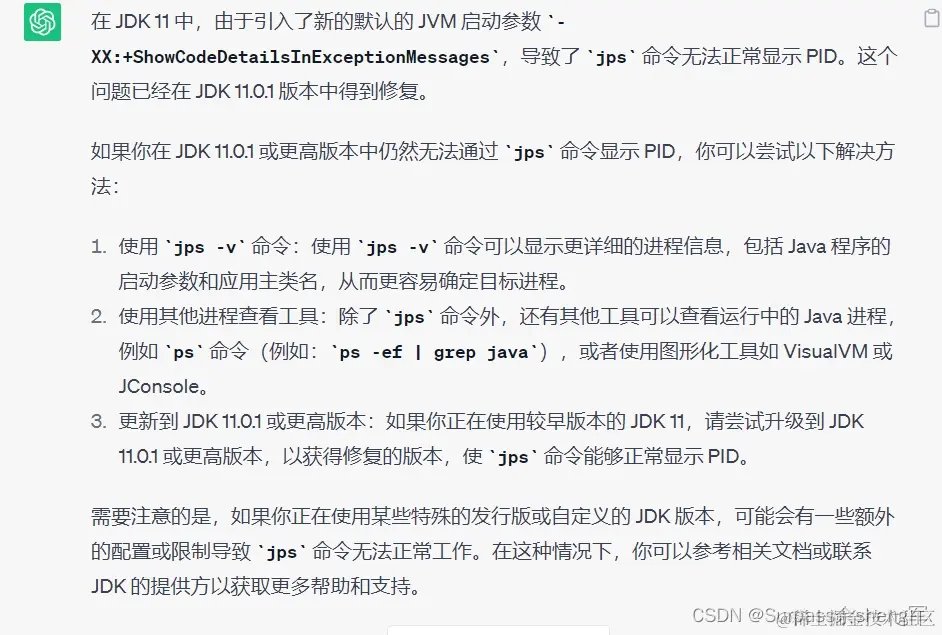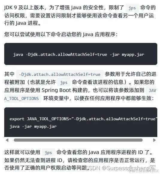 [命令行终端输入jps查不到进程ID]解决指南-CSDN博客 已注销 2023-10-21 104 阅读1分钟 我用的是JDK11,在之前不管是重新编译还是启动运行后,输入jps命令都查不到进程ID: 我在cmd窗口试了试也不行,不管是以普通用户打开还是以root管理员用户打开cmd都查询不到 于是我又问了AI, 它是这样说的: 还有这样说的: 我全部试了试,可以说毫无用处! 最后我想了想,能不能让这个线程阻塞一会儿,看能不能查到这个进程ID,果然成功了: 如果有帮助到你,那就太好啦!