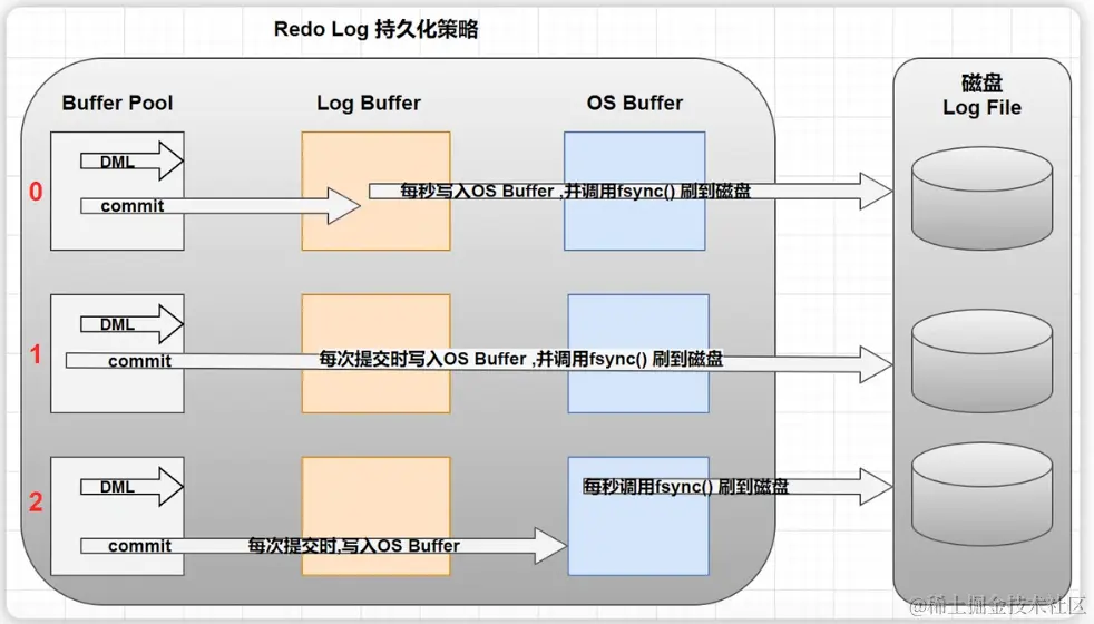 Redo Buffer持久化到磁盘上的redo log file的策略,可通过Innodb_flush_log_at_trx_commit设置: