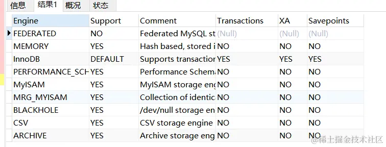- information_schema库: 包括InnoDB里面的数据、日志、事务、表;还有PROCESSLIST表:它记录了当前正在运行的数据库有多少个连接和查询进程的信息;ENGINES表:存储引擎插件表。