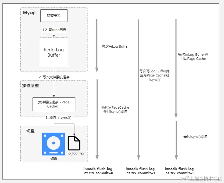 - 0(延迟写): 设置为0时,事务提交时不会将 redo log buffer中的日志写入到 os buffer,而是日志每秒从内存写入到操作系统的os buffer中,并且 调用 fsync() - 刷新*一次写入到磁盘中的 redo log file中。 *也就是说设置为0时大约每秒刷新写入到磁盘中的,当系统崩溃时,会丢失1秒钟的数据。没有刷新日志的事务可能会在MySQL服务崩溃时丢失。