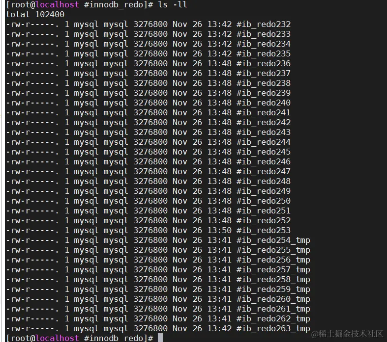 - 我们去磁盘发现,InnoDB维护了32个大小为 104857600 / 32 = 3276800 的RedoLog File文件