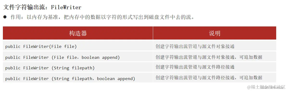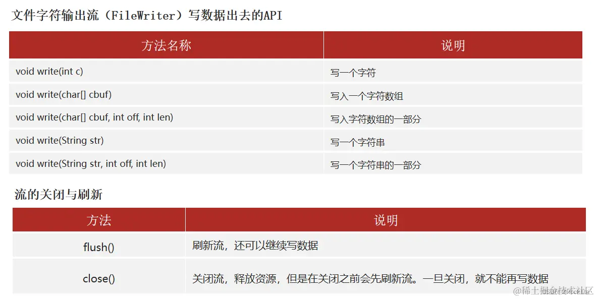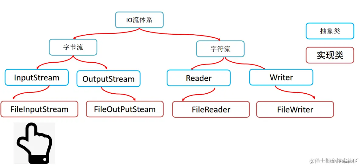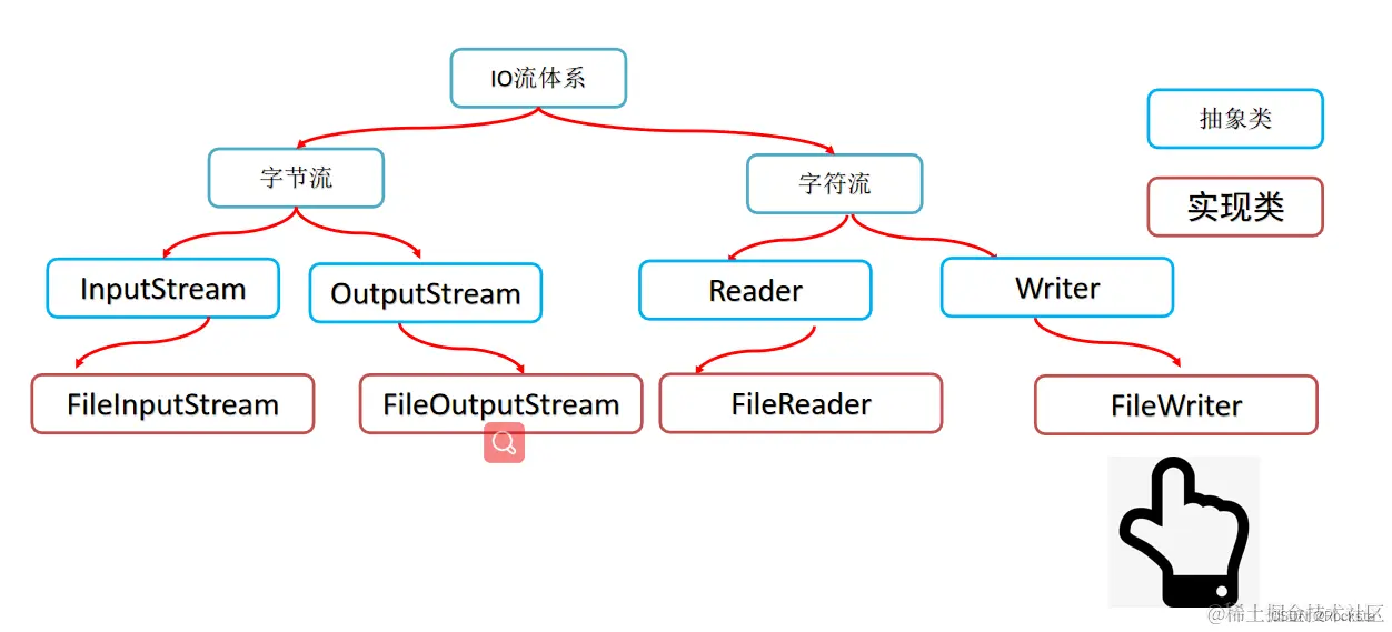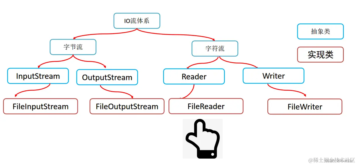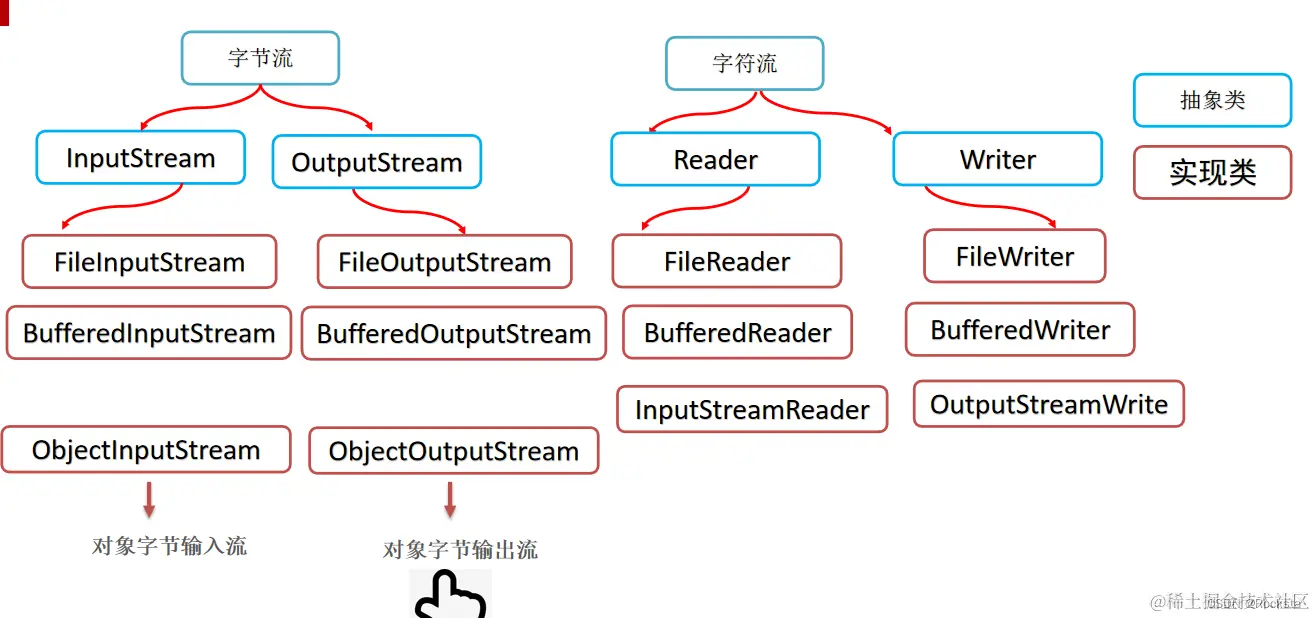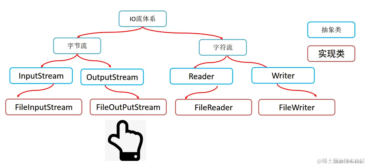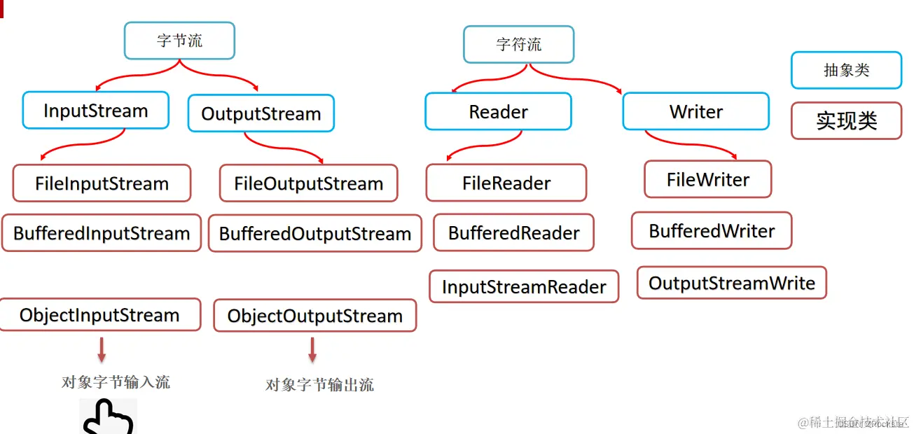 实现类: 文件字节输入流:FileInputStream 文件字节输出流:FileOutputStream- 文件字符输入流:FileReader 文件字符输出流:FileWriter
