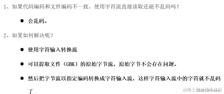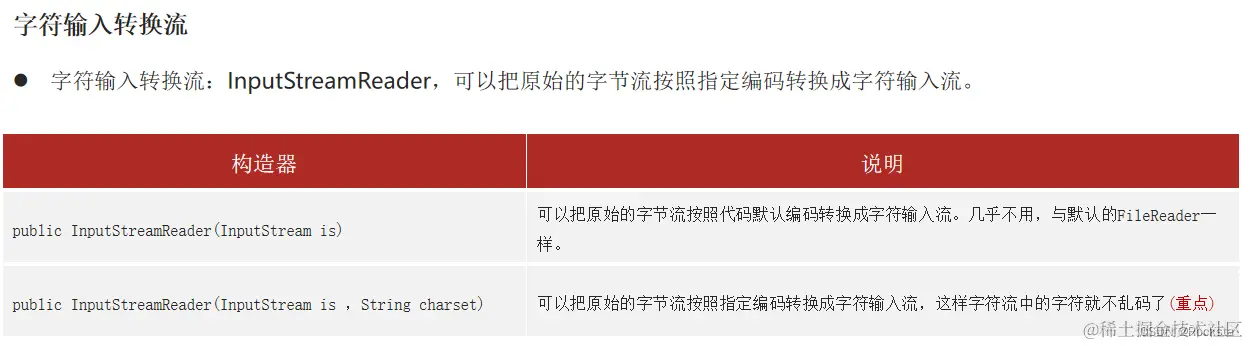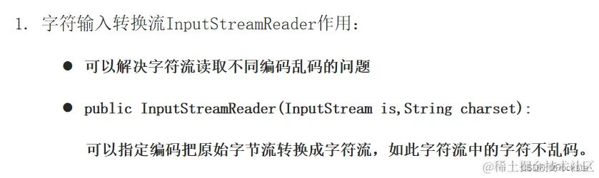 - 字符输入转换流:InputStreamReader,可以把原始的字节流按照指定编码转换成字符输入流