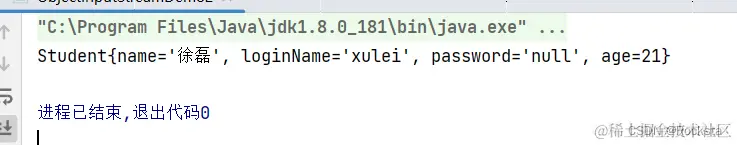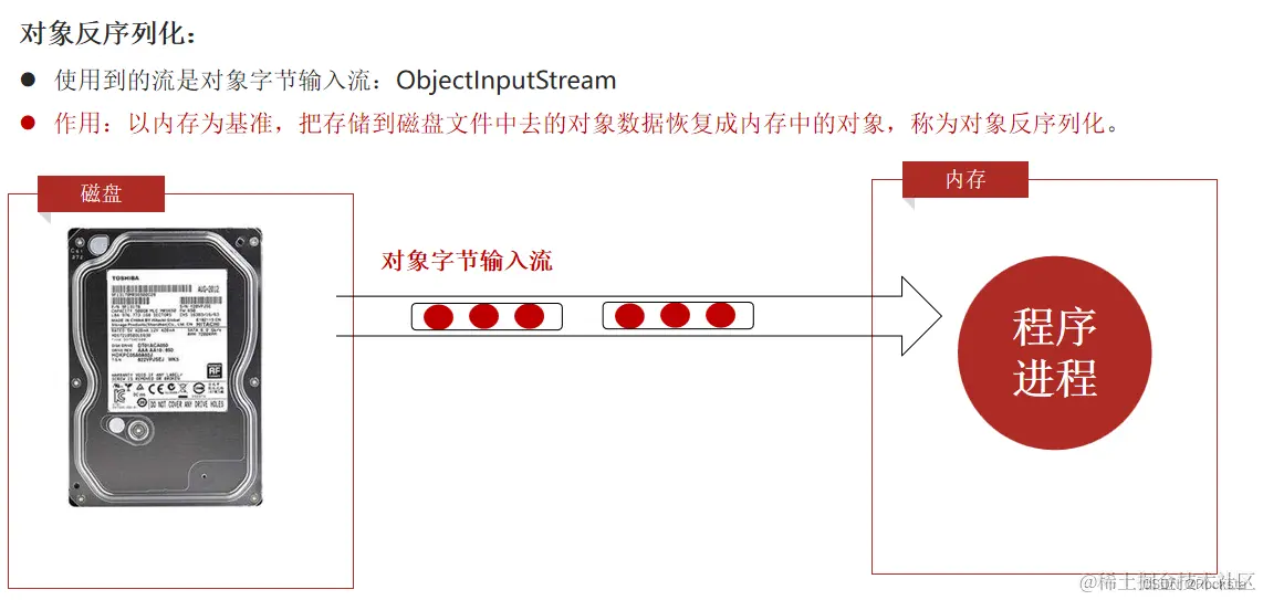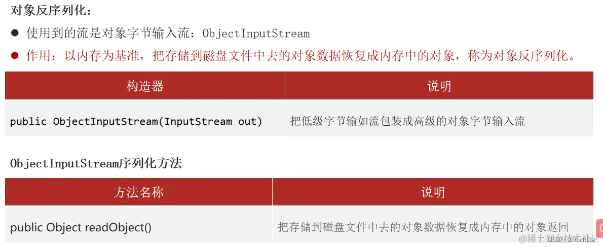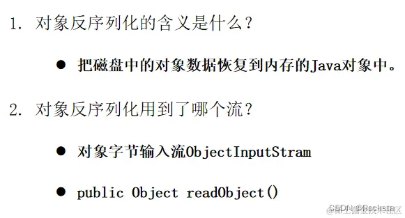 - 对象反序列化:使用到的流是对象字节输入流:ObjectInputStream