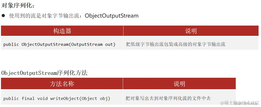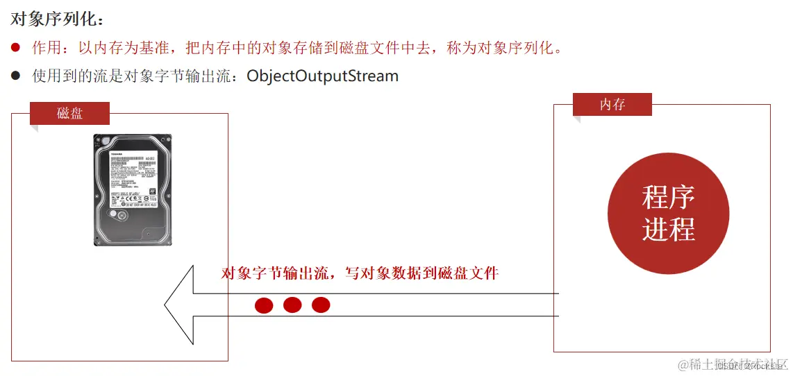- 使用到的流是对象字节输出流:ObjectOutrputStream,对象字节输出流,写对象数据到磁盘文件。