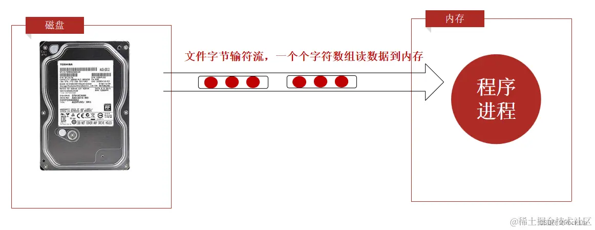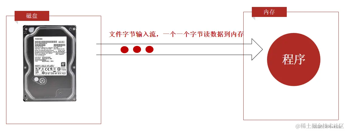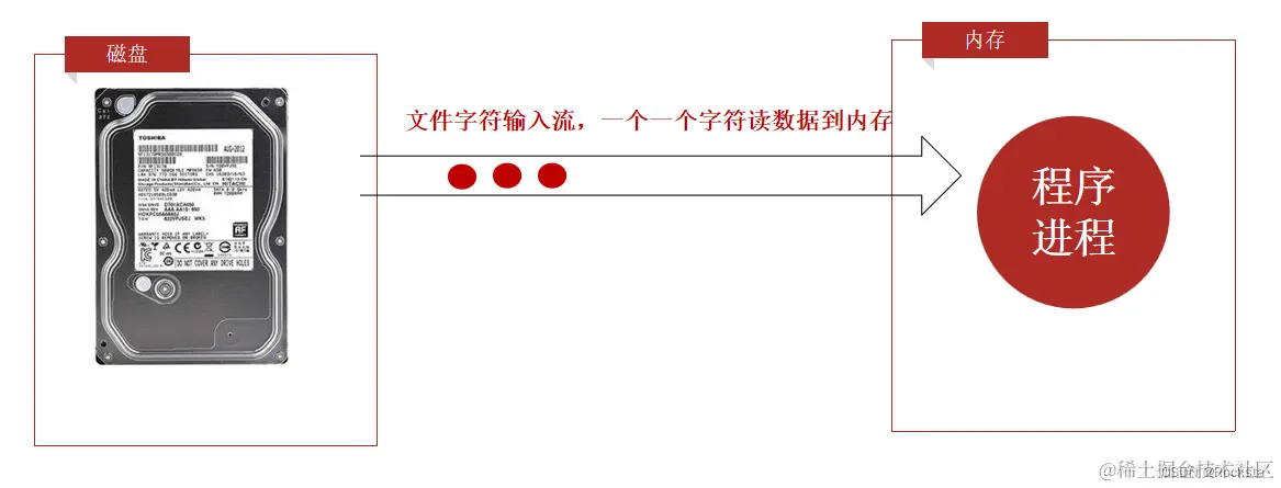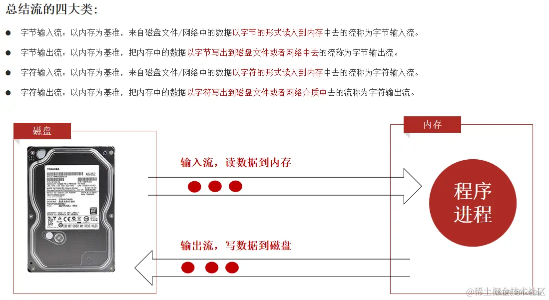 - 输入流:把磁盘文件中的数据读入到内存的过程,称为输入,负责读