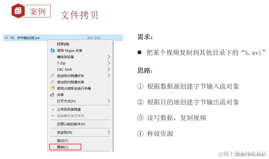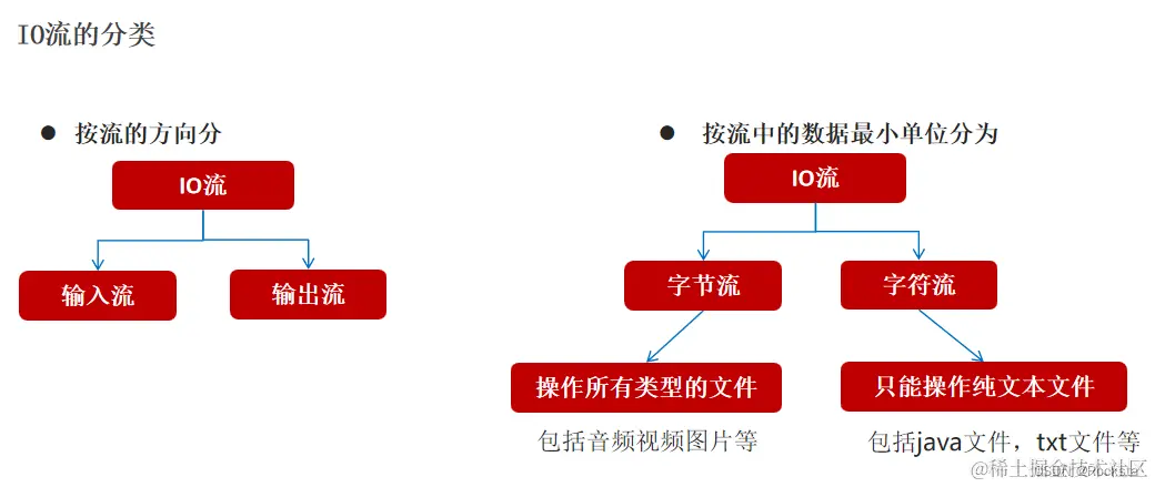 IO流按流中的数据最小单位可以分为:字节流和字符流- 字节流适操作所有类型的文件(包括音视频文件图片等)