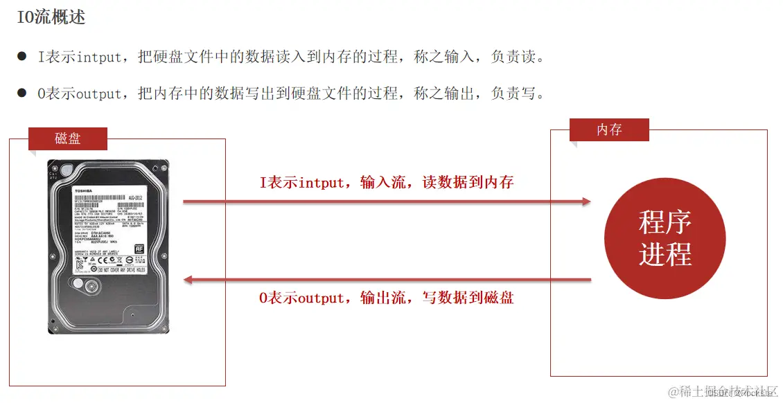 输出流:把内存中的数据写出到磁盘文件的过程,称为输出,负责写- 磁盘也叫做硬盘