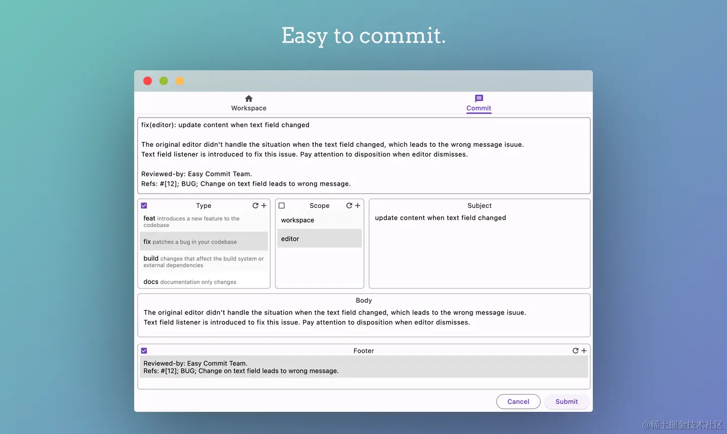 Easy Commit是一款开源的桌面软件,用来提交规范的commit message。