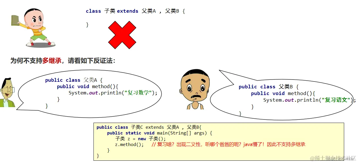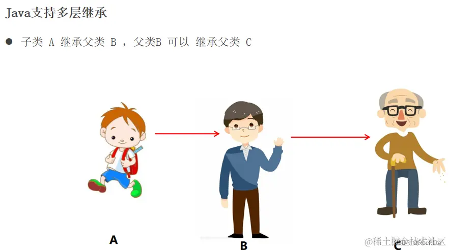 - Java不支持多继承(子类不能同时继承多个父类),但是支持多层次继承。