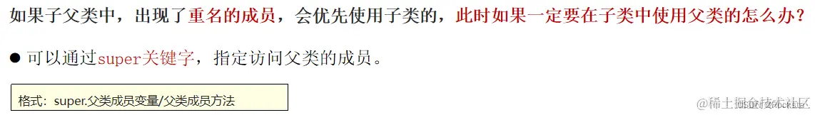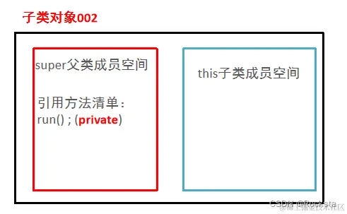 - 继承后,子类对象在堆内存中的内存原理:创建子类对象它对外是一个对象,创建子类对象在堆内存中,对内是两个空间:父类空间(super)和子类空间(this)。