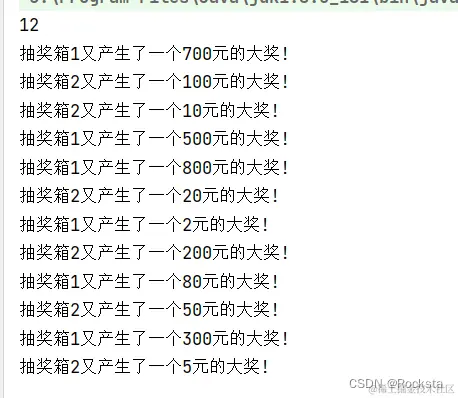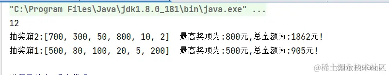 System.out.println("抽奖箱2:" + list2 + " 最高奖项为:" + Collections.max(list2) + "元,总金额为:" + sum2 + "元!");