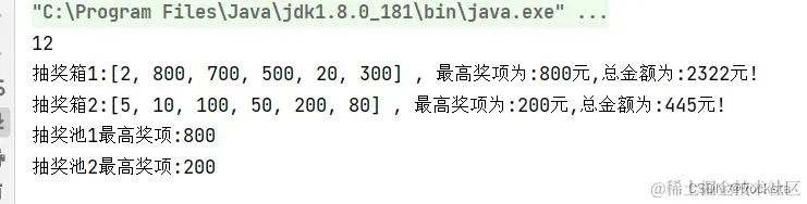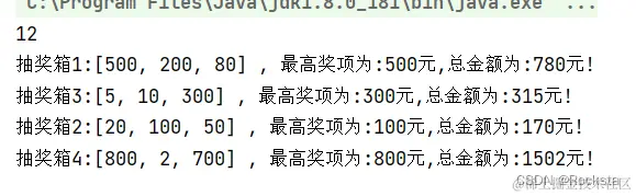System.out.println("抽奖箱1:" + list1 + " 最高奖项为:" + Collections.max(list1) + "元,总金额为:" + sum1 + "元!");