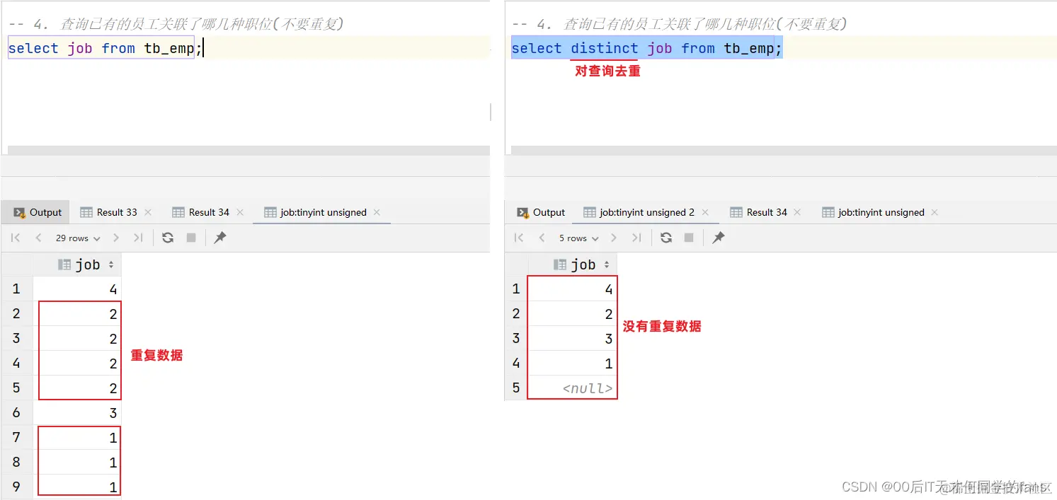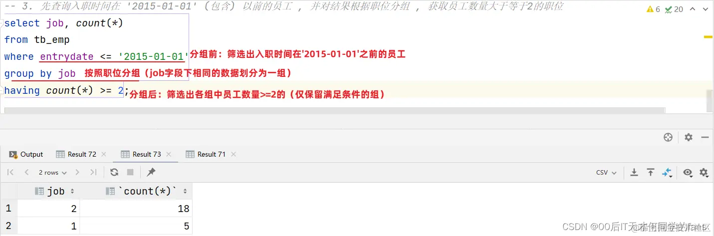 -- select job,count(*) from tb_emp where entrydate <= '2015-01-01' and count(*) >= 2 group by job;