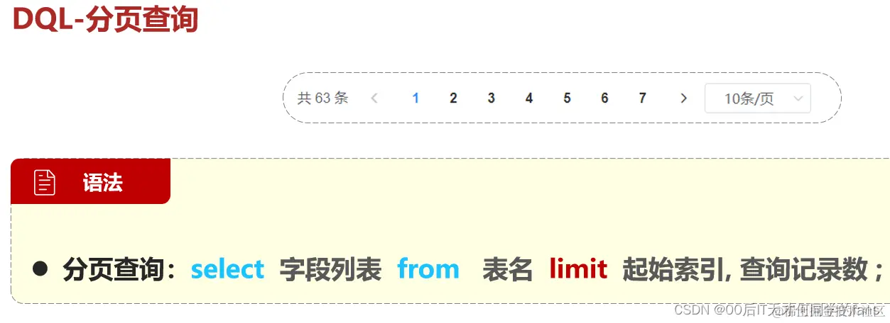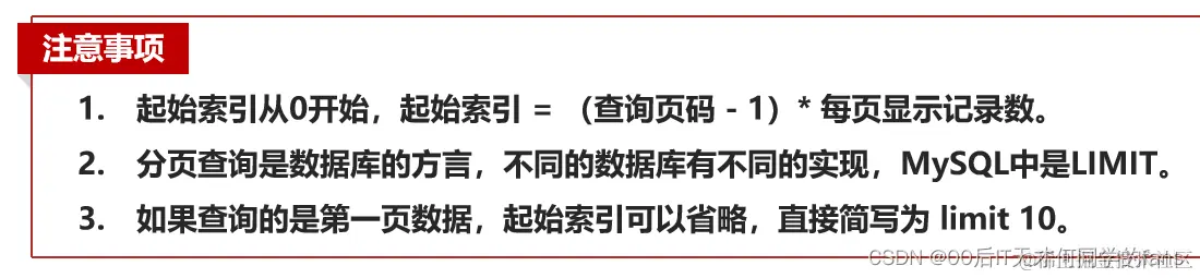 2. 分页查询它其实是属于数据库的方言,所谓数据库的方言指的就是各个关系型数据库之间它们不是通用的,是有不同实现的,不同数据库它们的分页实现方式也不一样,在MySQL当中用的是limit