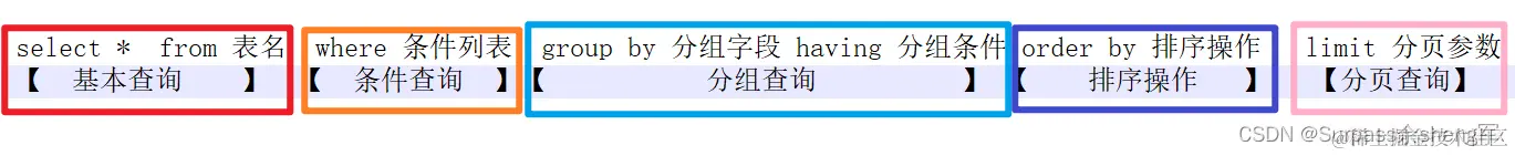 - 条件查询: 第二个部分就是条件查询,在基本查询后面可以加上一个关键字where,在where之后跟上条件列表,这里也可以传递多个条件。