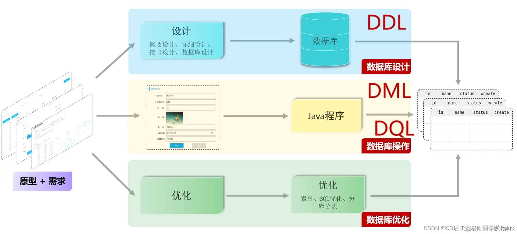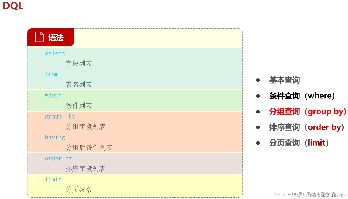 数据库中数据的查询操作,也就是DQL语句,DQL语句学习完毕之后,关于单表的操作就讲解完了。包括单表的设计,单表的增删改查。