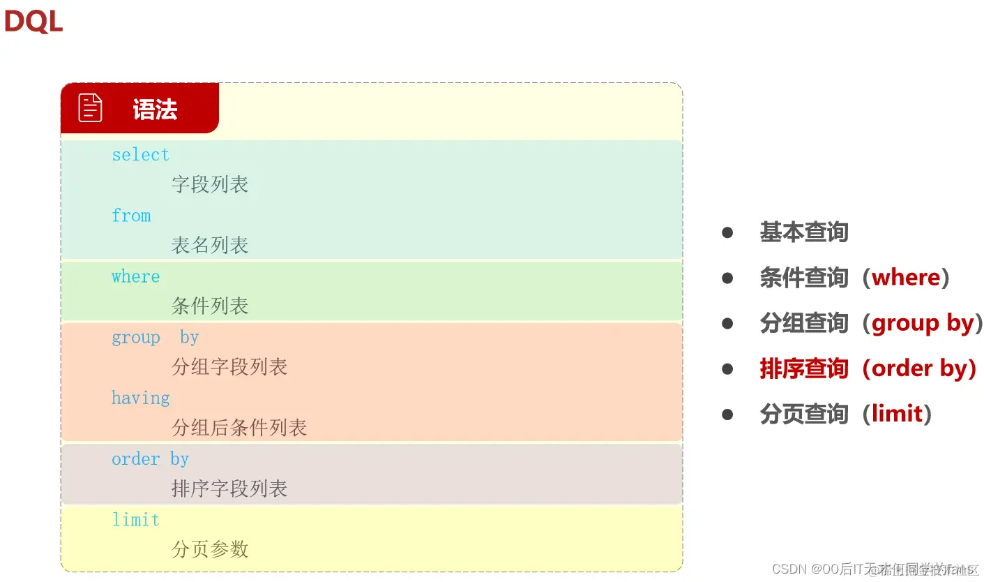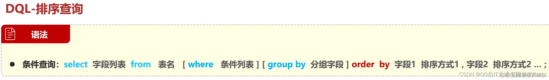- 排序操作: 再往下就是排序操作,我们只需要在后面再加上一个关键字order by,在order by之后跟上排序的字段,这里也是可以支持多个字段进行排序的。
