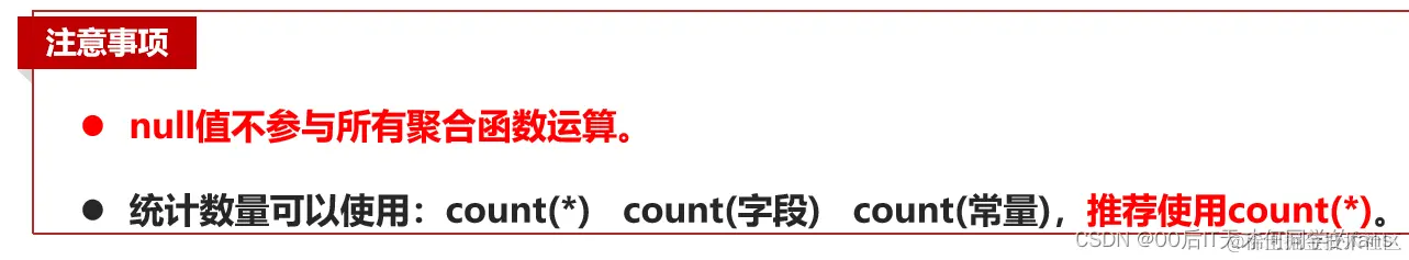 - 首先是where子句先运行,先进行条件的过滤,条件筛选完了之后不满足where条件的是不会进行分组操作的,所以第二个部分执行的就是分组操作加上聚合函数,这部分运行完了之后再来执行第三个部分那就是having子句,在having之后再来对分组后的数据进行条件的过滤。
