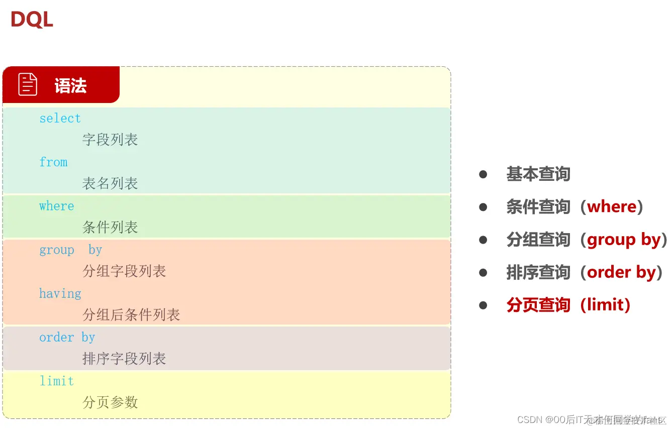 - 分页查询: 最后一个方面就是limit分页查询,需要在SQL语句的后面加上一个关键字 --- limit,在limit之后跟上分页参数。