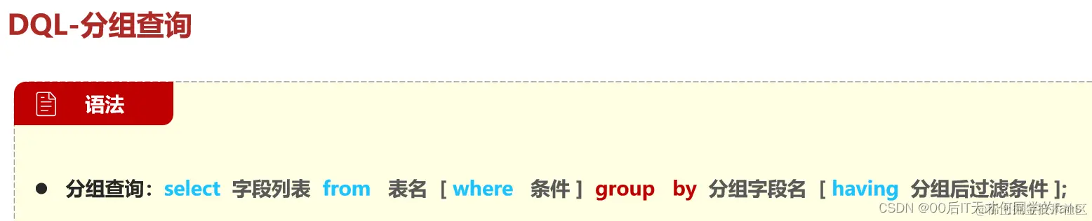 select 字段列表 from 表名 [where 条件] group by 分组字段名 [having 分组后过滤条件];