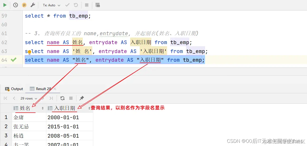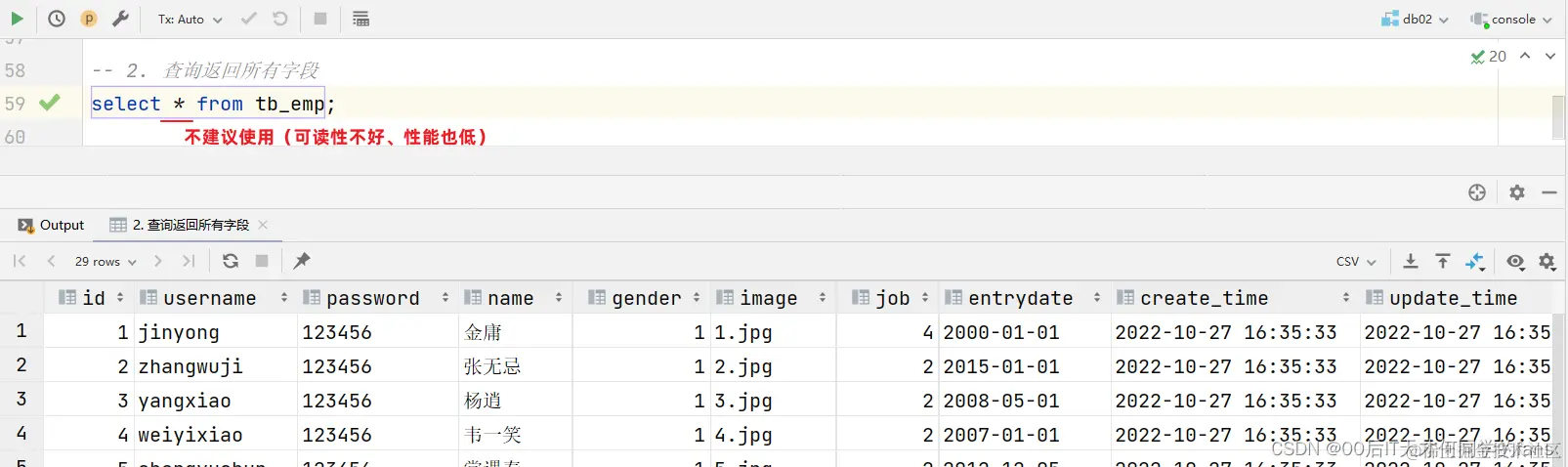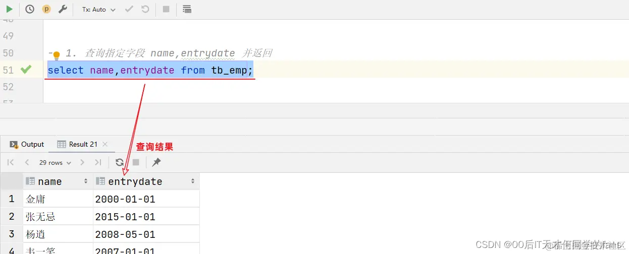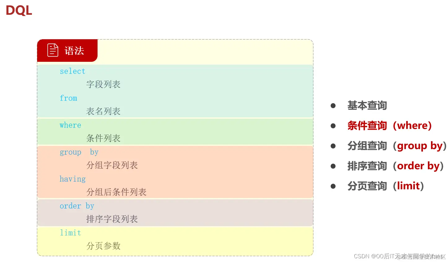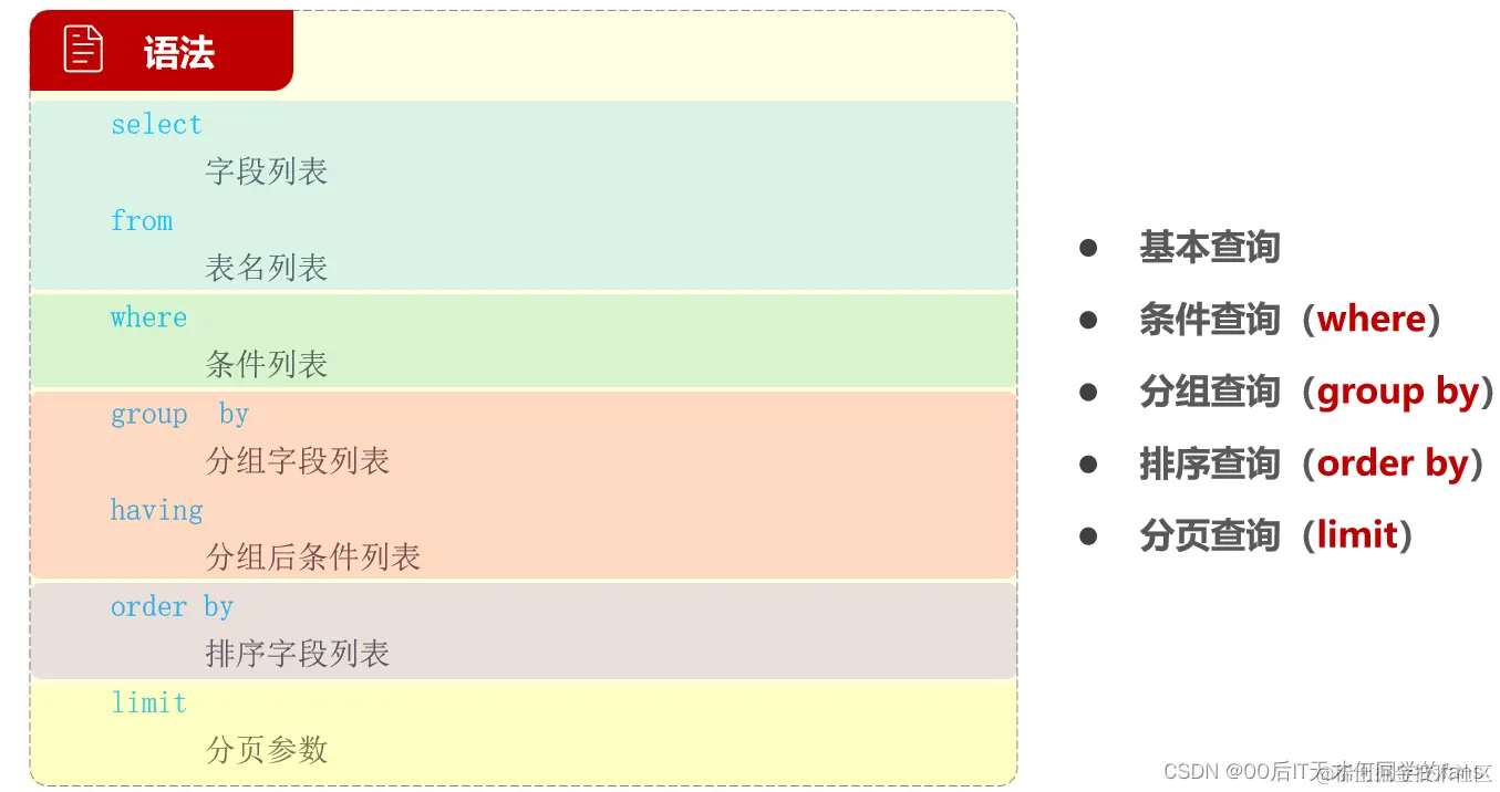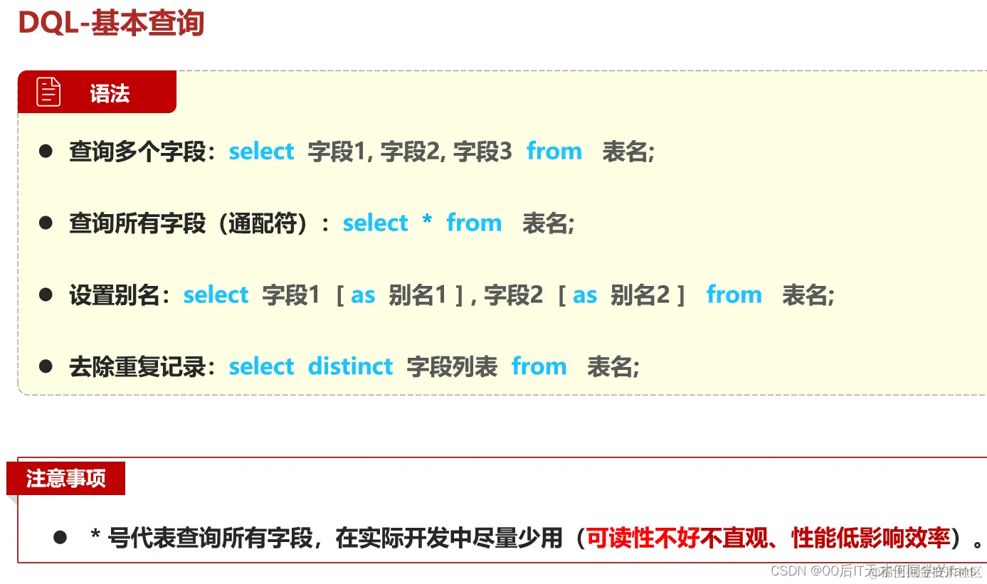 - 基本查询: DQL语句它的语法是以select开始,select之后跟上的是字段列表,就代表我们要查询返回表中的哪些字段,多个字段之间使用逗号分隔,from之后跟上表名列表,也就是说我们可以从多张表当中进行查询(今天先学习单表查询,后面再学习多表查询)。这就构成了第一个部分,也就是基本查询部分,在基本查询当中,我们只需要指定从哪一张表当中来查询,查询返回哪些字段。
