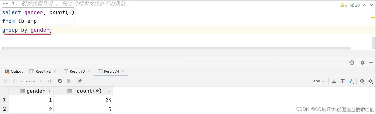 -- 1.根据性别分组,统计男性和女性员工的数量 -- count(*)