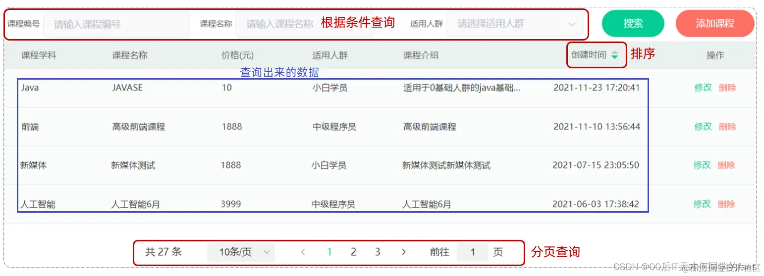 - 而为了更好的满足用户的需求,给用户提供更好的体验,我们也允许用户在上面根据条件/关键字来进行查询,在查询出来的这个结果当中,我们也可以对结果进行排序,比如我们可以按照创建时间进行升序排序,也可以按照创建时间进行降序排序。