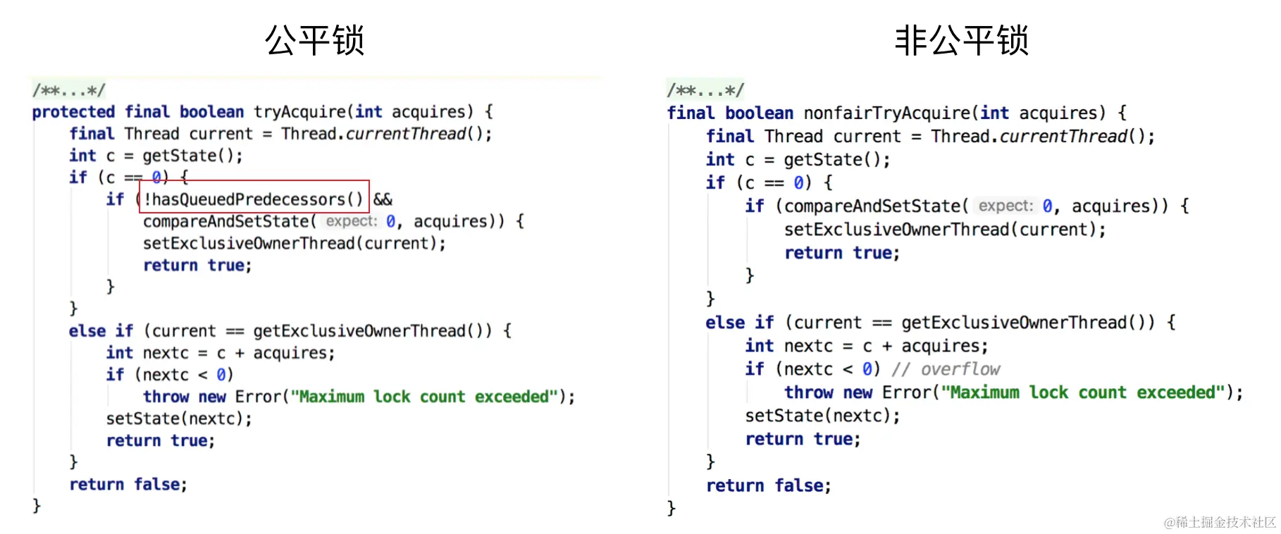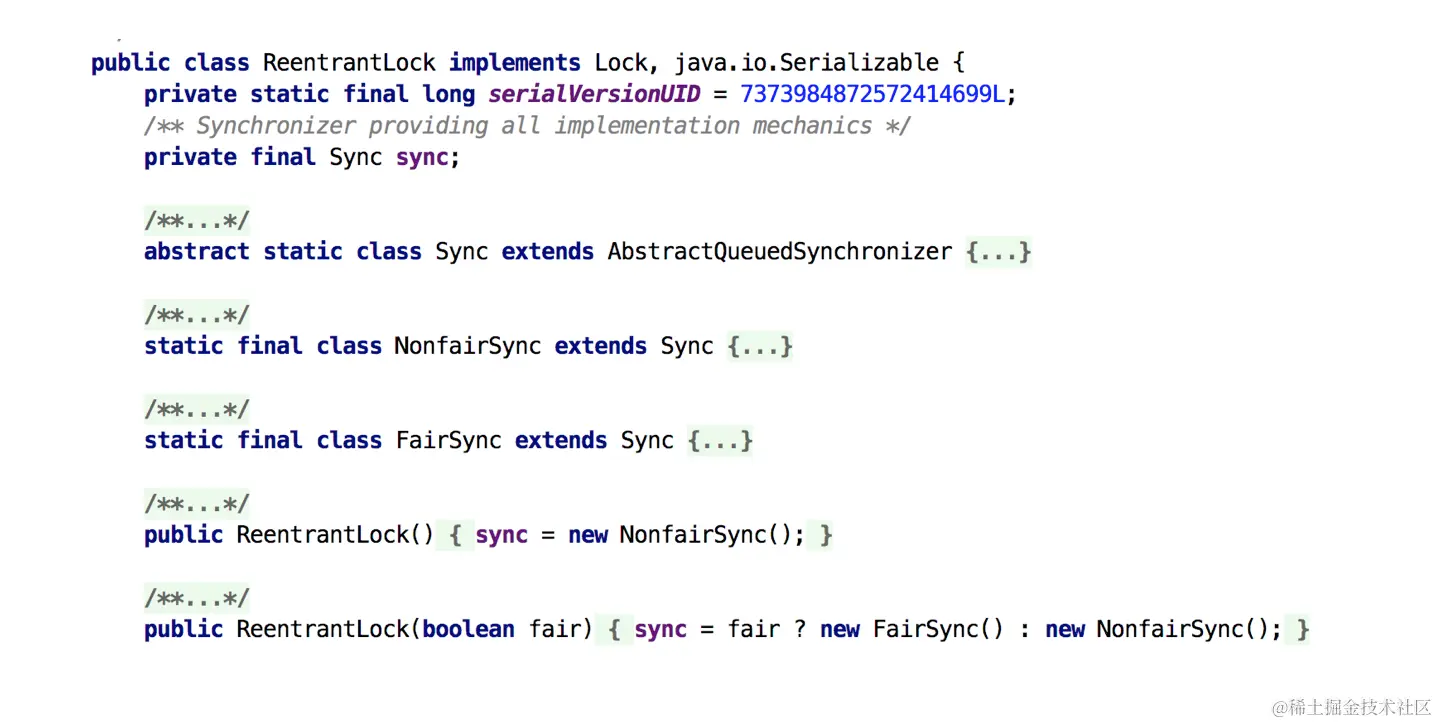 - 那么AQS作为互斥锁来说,它的整个设计体系中,需要解决三个核心的问题:第一个互斥变量的设计以及如何保证多线程同时更新互斥变量的时候线程的安全性;第二个未竞争到锁资源的线程的等待以及竞争到锁的资源,释放锁之后的唤醒;第三个锁竞争的公平性和非公平性,AQS采用了一个int类型的互斥变量"state"用来记录锁竞争的一个状态,0表示当前没有任何线程竞争到锁资源,而>=1,表示已经有线程正在持有锁资源,一个线程来获取锁资源的时候,首先会判断"state"是否等于0,也就是说它是无锁状态,如果是,则把state更新成1,表示占用到锁,而这个过程中,如果多个线程同时去做这样一个操作,就会导致线程安全性问题,因此AQS采用了CAS机制,去保证state互斥变量更新的一个原子性,未获得到锁的线程,通过Unsafe类中的park方法去进行阻塞,把阻塞的线程按照先进先出的原则去加入到一个双向链表的一个结构中,当获得锁资源的线程释放锁之后,会从这样一个双向链表的头部去唤醒下一个阻塞等待的线程再去竞争锁,最后关于锁竞争的公平性和非公平性的问题,AQS的处理方式是在竞争锁资源的时候,公平锁需要去判断双向链表中是否有阻塞的线程,如果有,则需要去排队等待;而非公平锁的处理方式是,不管双向链表中是否存在等待竞争锁的线程,那么它都会直接去尝试,更改互斥变量"state"去竞争锁,假设在一个临界点,获得锁的线程释放锁,此时state等于0,而当前的这个线程去抢占锁的时候,正好可以把state修改成1,那么这个时候就表示它可以拿到锁,而这个过程是非公平的,