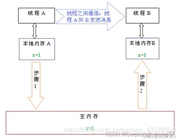 从上图来看,线程A与线程B之间如要通信的话,必须要经历下面2个步骤: