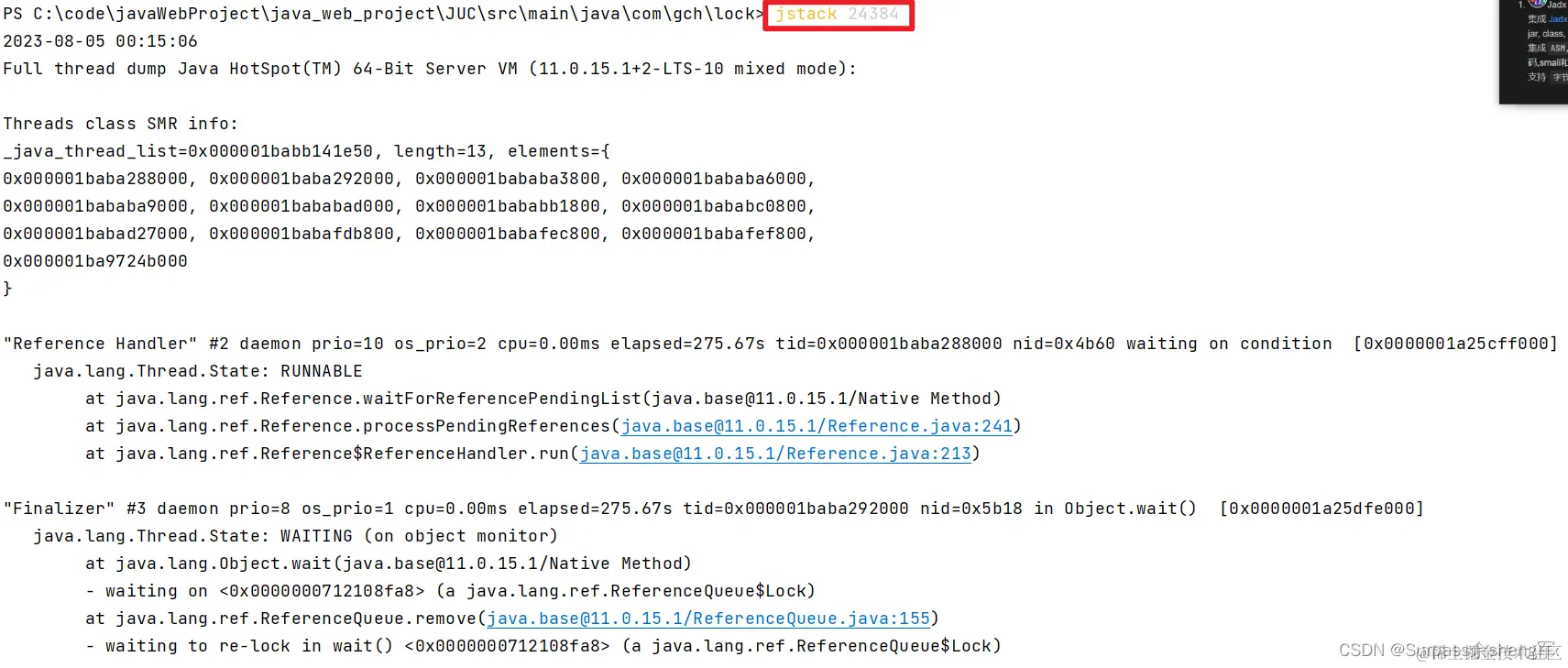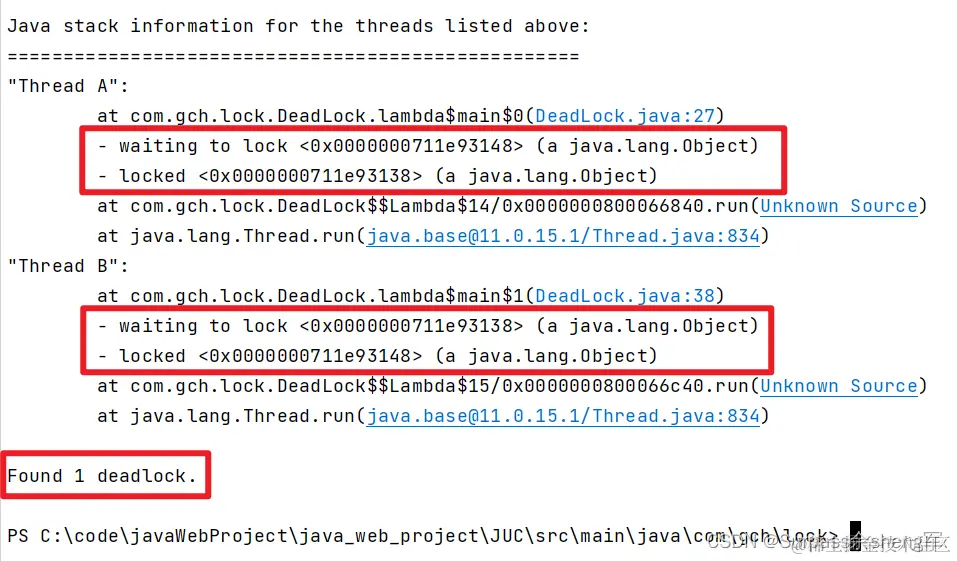2. 使用 jstack + 进程号 查看Java进程内线程的堆栈信息,找到死锁查看