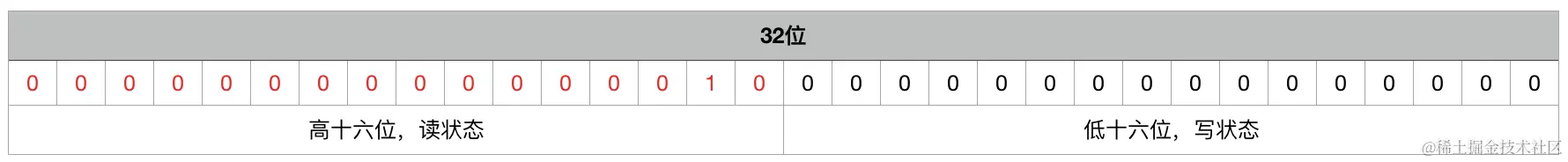 - 在独享锁中这个值通常是0或者1(如果是重入锁的话state值就是重入的次数),在共享锁中state就是持有锁的数量。但是在ReentrantReadWriteLock中有读、写两把锁,所以需要在一个整型变量state上分别描述读锁和写锁的数量(或者也可以叫状态) 。于是将state变量“按位切割”切分成了两个部分,高16位表示读锁状态(读锁个数),低16位表示写锁状态(写锁个数)。如下图所示: