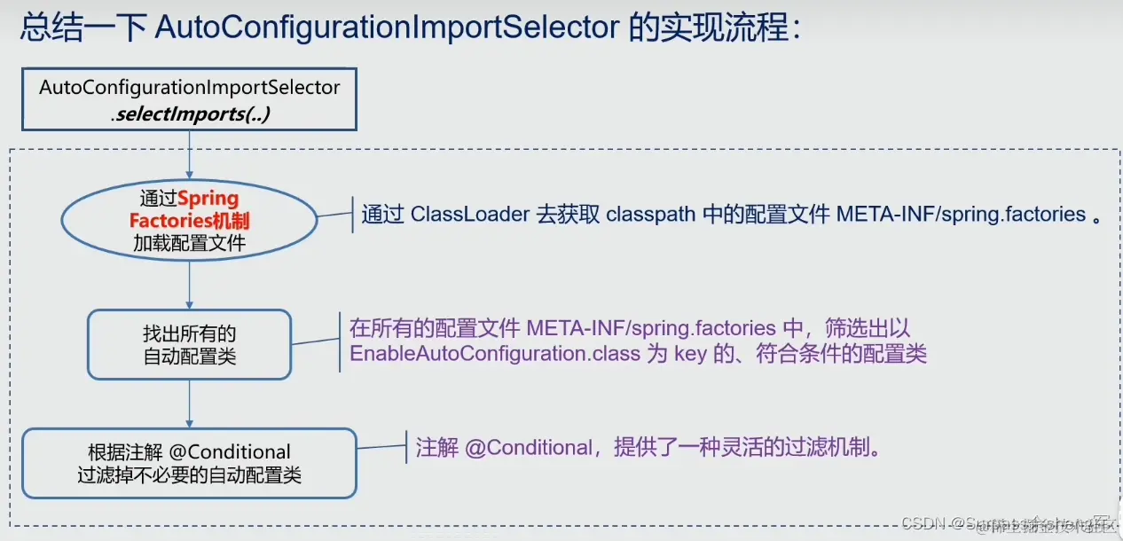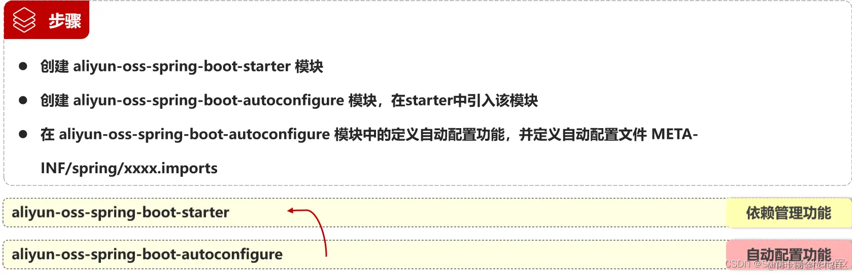 我们需要定义自动配置类,将需要自动配置的Bean都定义在这个自动配置类当中,然后在配置文件AutoConfiguration.imports当中来配置自动配置类的全类名,将来SpringBoot项目在启动的时候就会自动的加载这份儿配置文件,将文件当中所配置的自动配置类直接导入到Spring的IOC容器当中,在项目当中,我们要想使用该Bean对象,直接进行依赖注入即可。