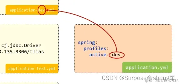 - 开发环境,我可以定义一份配置文件叫application-dev.yml develop-开发