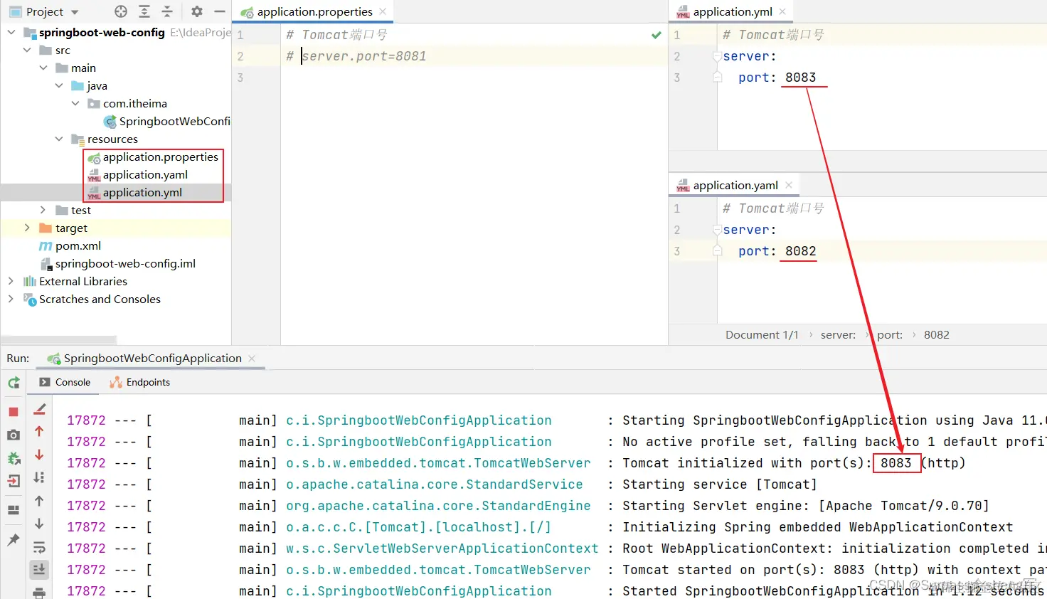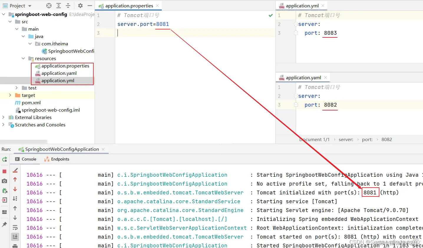 那么如果项目中同时存在这三种配置文件,且都配置了同一个属性,如:Tomcat端口号,到底哪一份配置文件生效呢?