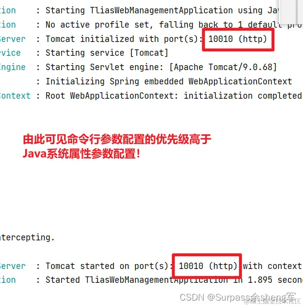 重启服务,同时配置Tomcat端口(三种配置文件、系统属性、命令行参数),测试哪个Tomcat端口号生效:
