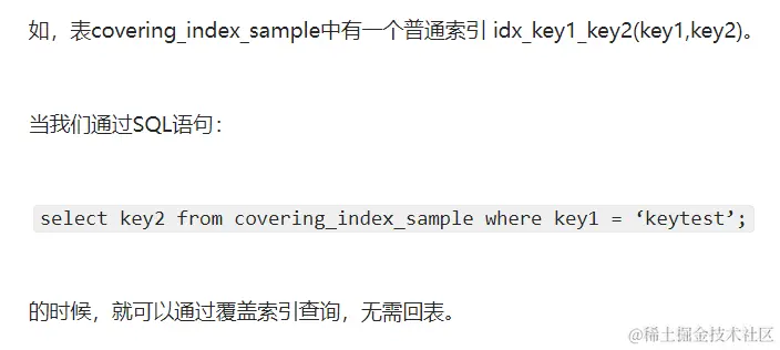 - 覆盖索引是指SQL语句中查询的所有字段,在二级索引的B+Tree的叶子节点上就可以找到,而不需要再去聚簇索引的B+Tree中去查询获得,从而避免回表的操作,也就减少了大量的磁盘IO操作。