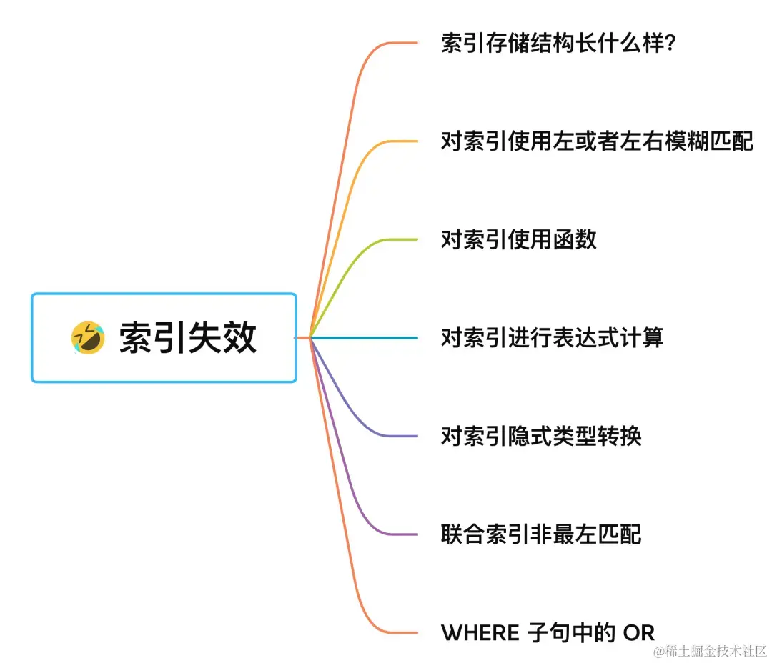 查询语句中用上了索引并不意味着查询时使用到了索引,这里简单说一下,发生索引失效的情况: